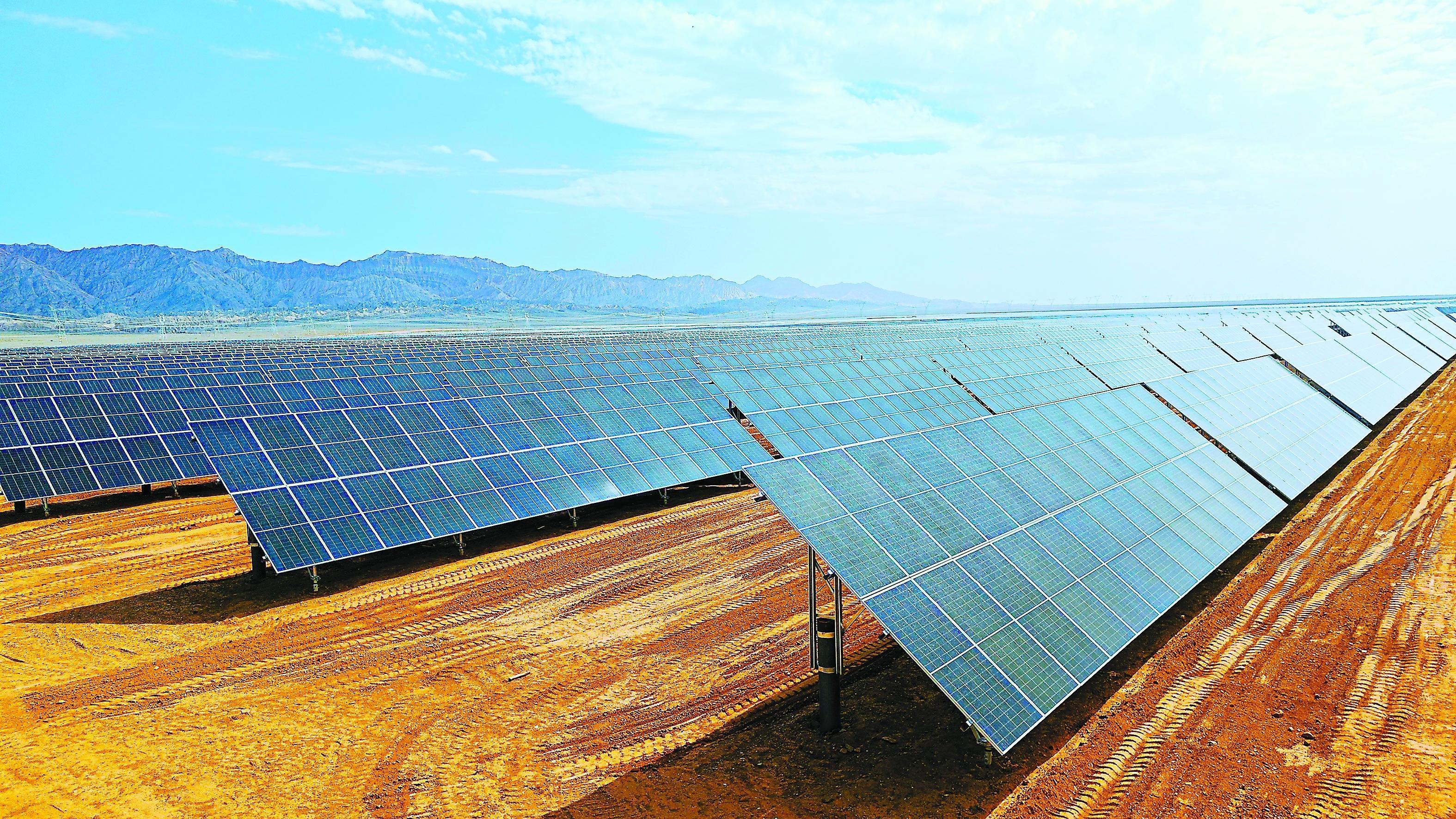 2023年6月,当所有箱变完成带负荷测相量工作通过测试成功并网发电时,光伏发电板的那一抹深蓝与长天的蔚蓝融为一体。面对这动人的风景,建设者们追光逐日的信念更加坚定。(黄 俭 窦海健)