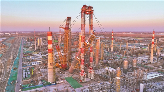 2月26日,在华锦阿美精细化工及原料工程项目施工现场,工程建设公司一建分公司利用自主研发的MYQ型5000吨门式起重机与4000吨履带式起重机协同作业,经过1小时36分钟的精细操作,成功将总重量达4366吨的抽余液塔精准吊装到位。