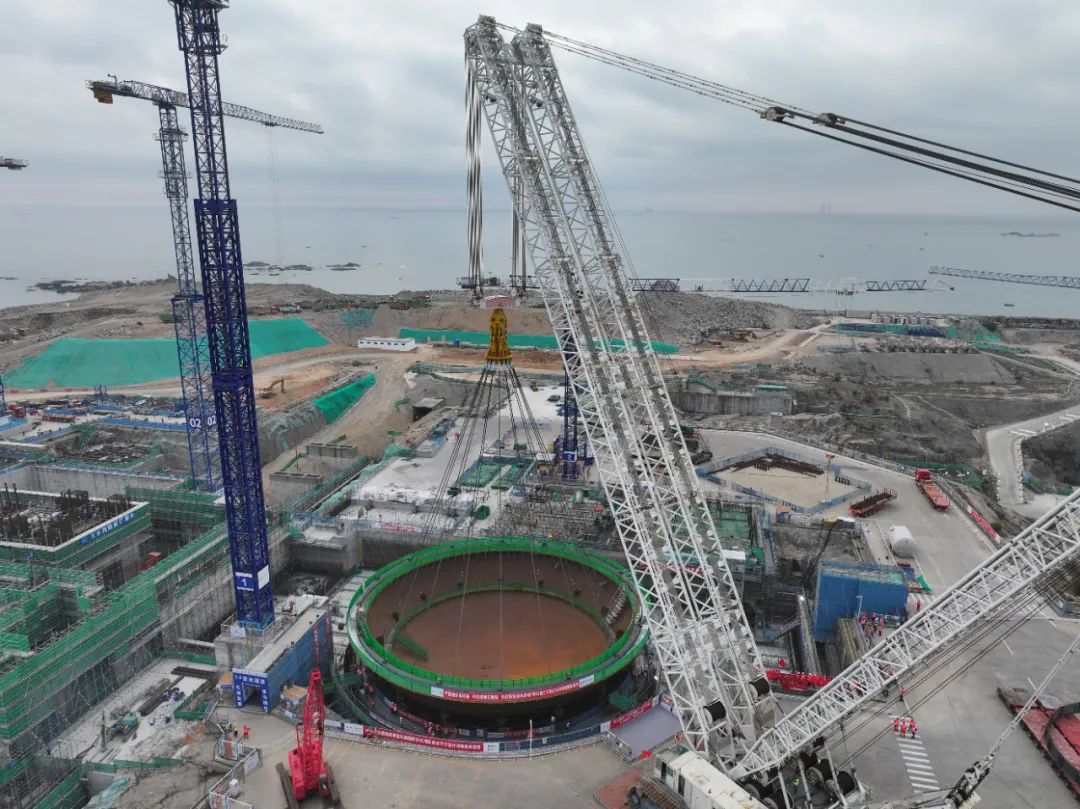 钢制安全壳是核岛的安全屏障,整个钢制安全壳由底封头、4个环段以及顶封头共6个部分拼装而成。与“华龙一号”机组不同,钢制底封头为CAP1000机型特有设计,本次吊装的CV底封头呈半球状,高11.4米,最大内径39.6米,吊装总重量约843吨。