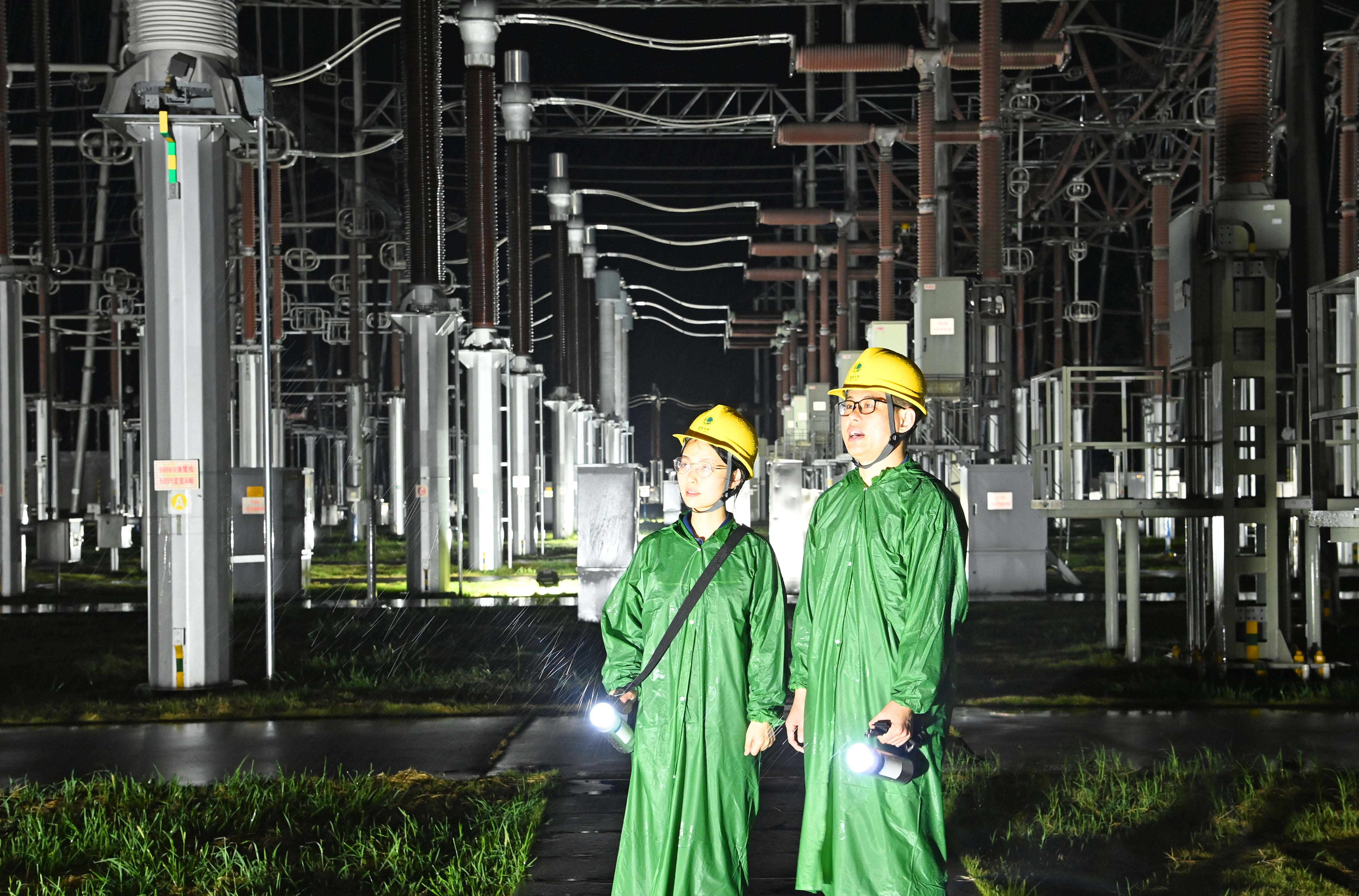 中国能源新闻网讯(宋卫星 何金鑫)7月31日,在安徽省滁州市南谯区珠龙镇500千伏清流变电站,工作人员冒雨对站内供电设备进行夜间特殊巡检,确保台风期间电力供应。当日,受今年第8号台风“竹节草”影响,安徽省滁州市普降大雨。当地电力部门启动应急预案,20余支抢修抢险队伍第一时间投入防台风防汛抢险,全力保障群众可靠电力供应。