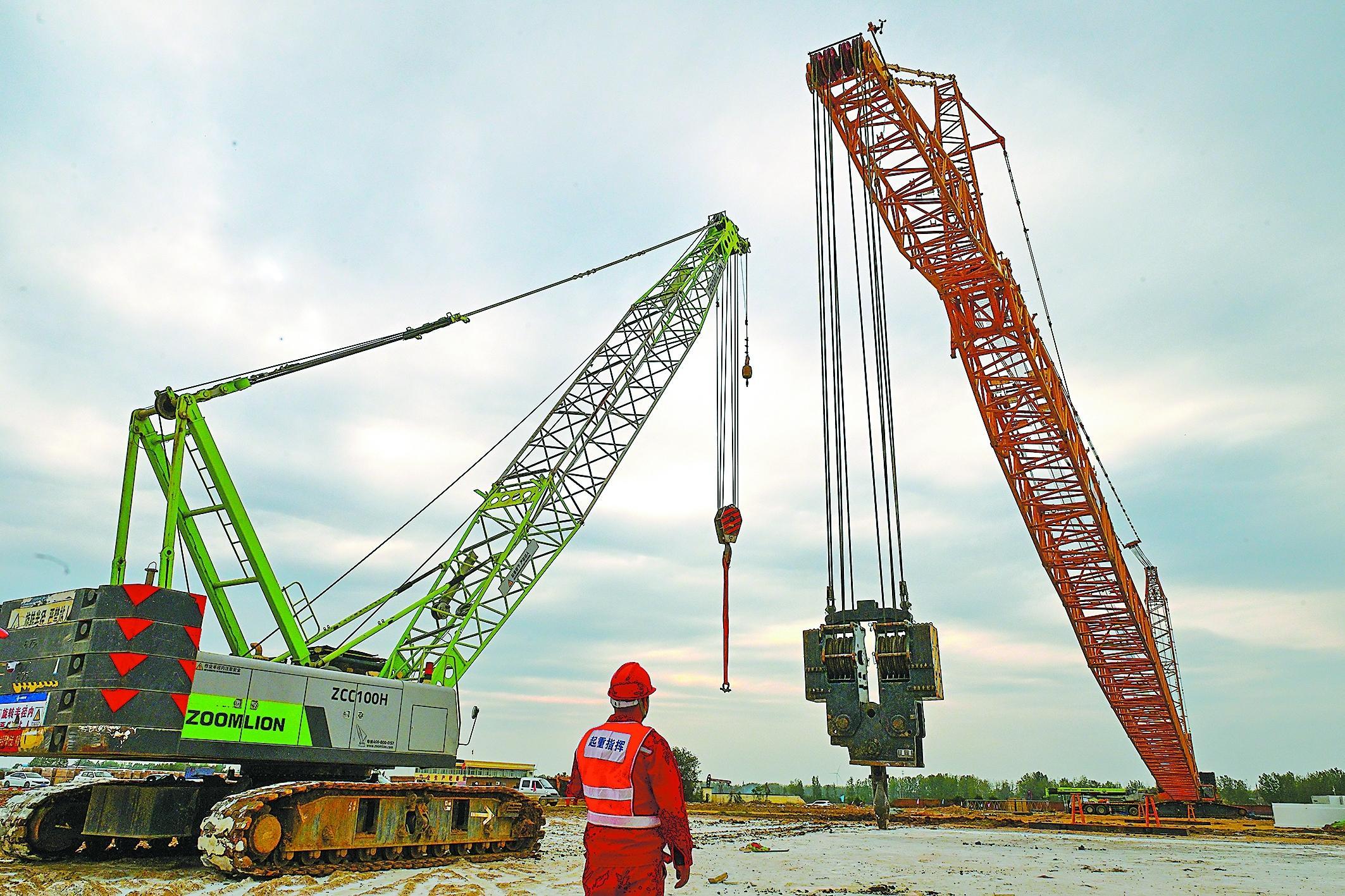 10月13日,河南油田重点建设项目江河1号风电项目由基础施工阶段转入风机吊装阶段,专用的650吨重型特种吊机已完成现场组装与调试工作,为项目后续风机设备吊装工作顺利开展奠定了坚实基础。图为重型特种吊机组装现场。(戚剑峰 摄 范 宁 黄涛 文)