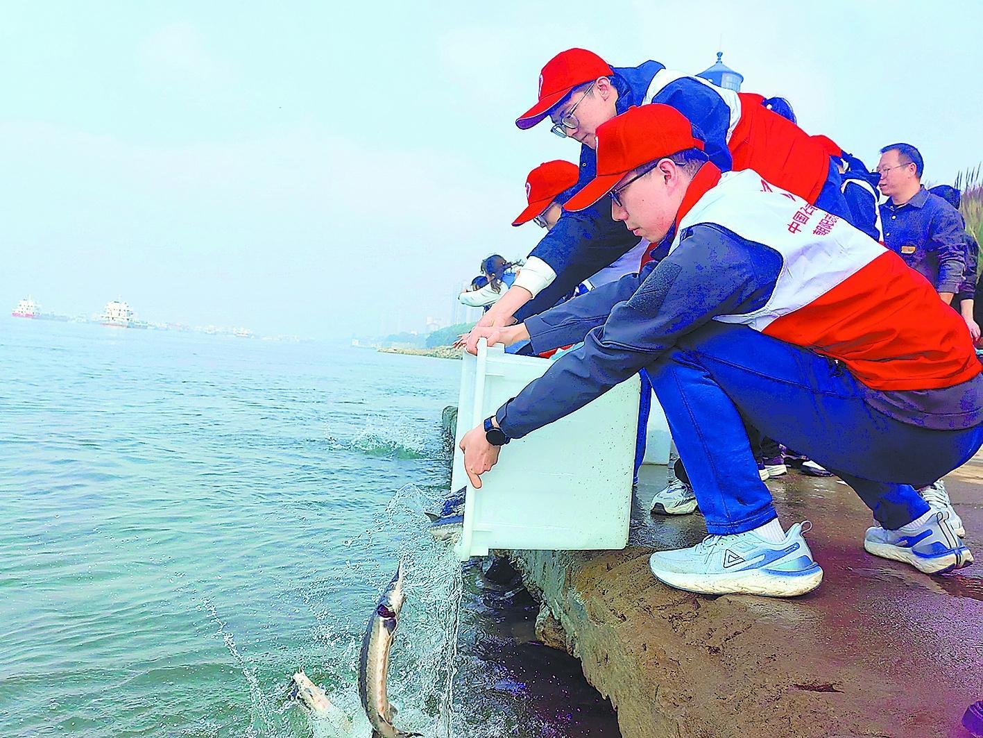 日前,由长江湖北宜昌中华鲟自然保护区管理处主办的中华鲟增殖放流活动,在宜昌市灯塔广场江畔举行。湖北石油积极参与,以实际行动守护长江生态。此次放流的1400尾小中华鲟均植入了PIT射频标记,便于科研人员持续跟踪监测。图为湖北宜昌石油员工放流小中华鲟。