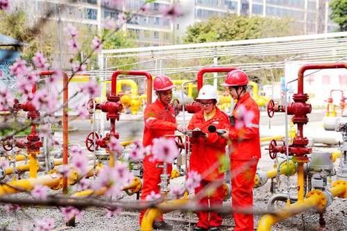3月16日,初春的重庆春意盎然。西南油气田公司重庆气矿江北采输气作业区采气工崔剑与管理人员,手持平板通过数据分析生产状况,确保供气安全稳定。