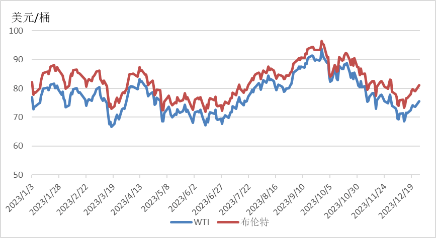 欧佩克+新增减产量低于市场预期,且市场质疑减产履约力度,加上对中国原油需求前景的担忧,共同推动国际石油价格持续下跌。然而红海航路危机加剧搅动国际原油市场,推动欧美原油期货反弹。截至12月26日,WTI、布伦特原油期货价格分别收于75.57美元/桶、81.07美元/桶,环比分别上涨0.95%、1.50%。