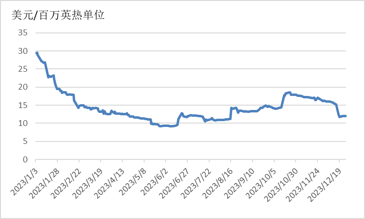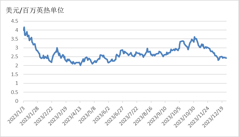 截至12月26日,美国Henry Hub天然气主力合约收于2.42美元/百万英热单位,月环比下降17.97%,相较于2022年同期的5.12美元/百万英热单位,下降52.73%。