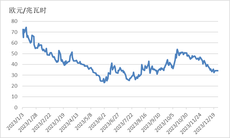截至12月26日,TTF天然气期货主力合约收于34.174欧元/兆瓦时,月环比下降22.31%,相较2022年同期的80.045欧元/兆瓦时,下降57.31%。