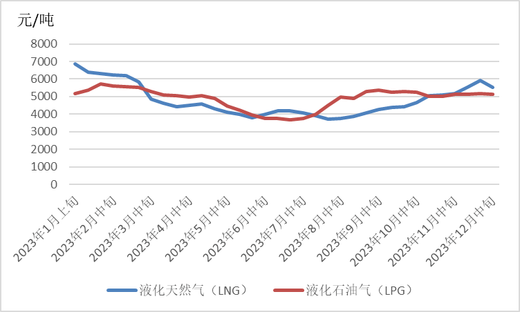 12月国内LNG价格继续上涨。12月中旬LNG价格环比上涨346元/吨,至5508.8元/吨,涨幅6.70%;LPG价格环比下降6.7元/吨,至5143.8元/吨,降幅0.13%。