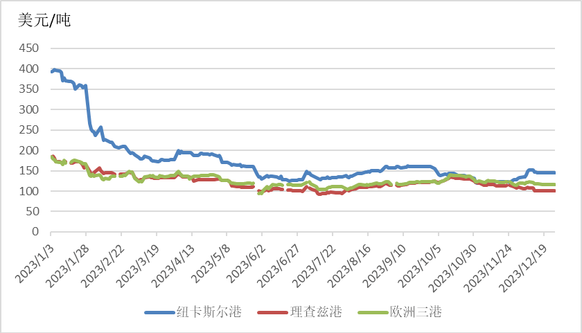 截至12月26日,澳大利亚纽卡斯尔港煤炭期货价格报收于145.5美元/吨,月环比上涨14.12%,相较2022年同期的400.5美元/吨,下降63.67%;南非理查兹港煤炭期货价格报收于101.15美元/吨,月环比下降9.49%,相较2022年同期的208美元/吨,下降51.37%;欧洲三港煤炭期货价格报收于115.85美元/吨,月环比下降0.77%,相较2022年同期的229美元/吨,下降49.41%。