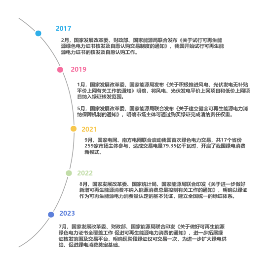 为加快形成能源绿色消费观念,2017年,我国开始试行绿证核发和自愿认购制度,并于2019年将风电、光伏发电平价上网项目纳入绿证交易范围,进一步扩大绿证覆盖面。