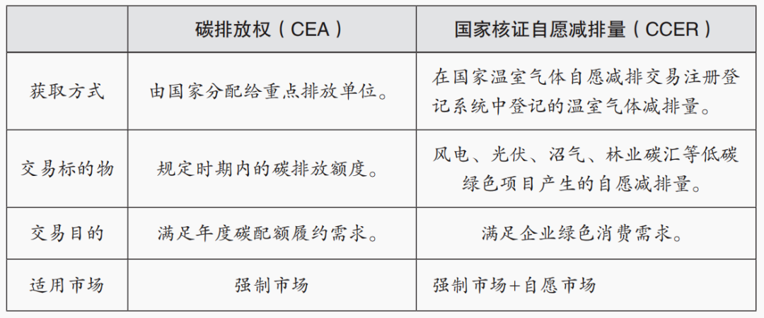 从履约形式和减排主体来看,CCER与CEA存在明显区别。CEA是强制减排市场,以碳配额为交易对象,相关主体必须完成履约指标。而CCER则为一种市场化激励手段,交易对象为风电、光伏、沼气、林业碳汇等低碳绿色项目产生的自愿减排量,相关主体可以将项目减排量通过市场交易实现环境价值变现获得经济收益,可以看作是碳市场框架体系下对自愿减排主体的补偿和奖励。