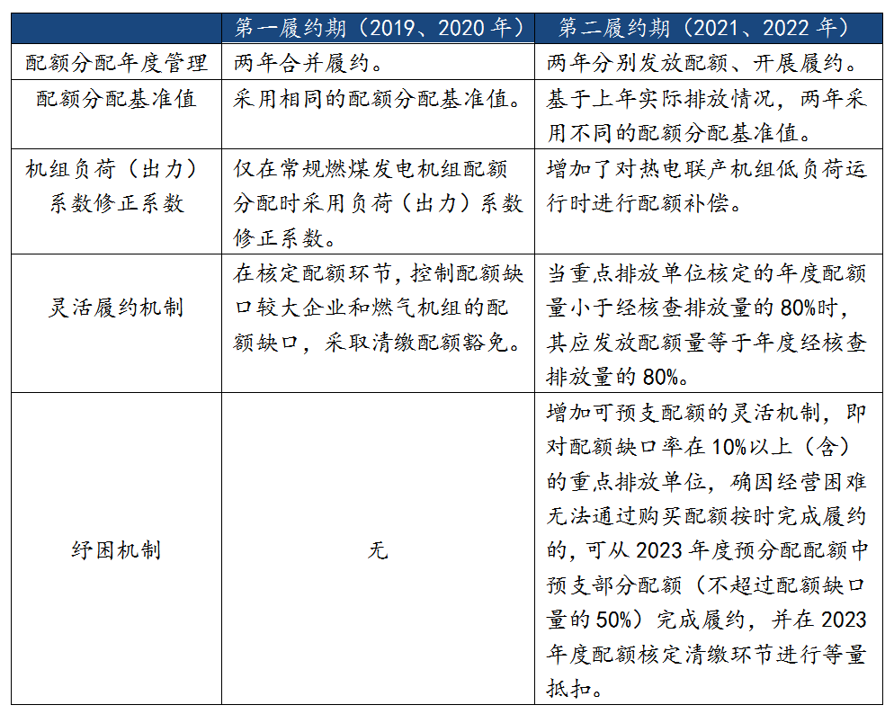 从运行机制来看,第二个履约期基本沿袭了前一次的总体框架。例如,两次碳市场的履约周期均为两年,配额分配的覆盖主体同为电力行业,市场运行采用强制市场的履约机制且以碳配额为交易标的。在抵消机制上,重点排放单位每年可以使用国家核证自愿减排量抵消碳排放配额,但比例不得超过应缴配额的5%。