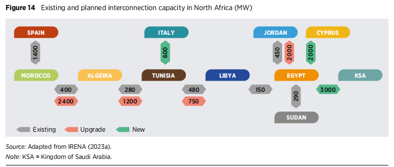 北非国家与邻近地区的贸易行为有助于提高北非国家发展部署可再生能源的比例,帮助其提高电网的稳定性并降低电价;在北非内部,各国间也有着电网联通。如果一国的电力生产超过了自身的使用需求,它可以通过出口电力来获得额外的收入。