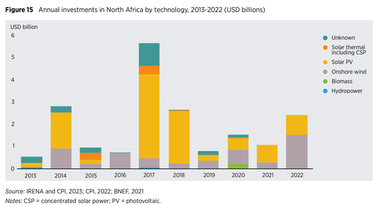 在过去的20年中,全球可再生能源投资快速发展。尽管非洲大陆拥有巨大的可再生能源发电潜力,但2000至2020年全球2.8万亿美元的投资中仅有2%流向非洲。在非洲各地区的投资数额中,北非位列第二,其投资主要集中在摩洛哥和埃及,并在2017年达到了数额巅峰。