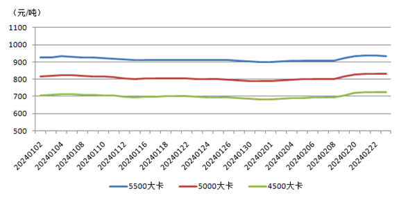◆2024年以来,市场需求端表现疲软,用煤企业特别是煤电企业在长协煤和进口煤的支撑下,库存保持高位,采购积极性较低,即使寒潮来袭也并未引发集中补库采购行为。春节期间,北方港口库存持续下降,且市场可流通货源较少,春节后贸易商挺价情绪较浓。春节后首个交易日煤炭市场价格开门红,但下游整体需求释放有限,且终端企业观望情绪较浓,节后反弹难以持续。2月27日CECI曹妃甸指数5500大卡报收于931元/吨,较前一日下跌3元/吨。3月份,产地煤炭供应水平逐步提升,下游电企短期内仍以刚需补库为主,需求释放有限。钢铁、水泥等非电行业补库需求预期增加,但预计对高价格接受程度有限,煤炭市场价格上涨有压力,或继续维持震荡运行。