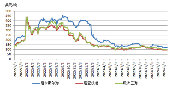 由于近年来欧洲对液化天然气的大量进口,以及冬季气温偏高,欧洲动力煤进口持续低迷。2024年1月,虽然欧洲多地普遍降温,但并未能明显消耗当地高库存,终端用户对动力煤的补库需求有限。欧洲地区煤炭市场价格延续波动下降的趋势,且随着未来气温逐渐升高,有可能进一步走低。目前欧洲ARA三港库存持续增多,已积累至将近700吨。欧洲ARA三港6000大卡动力煤到岸价降至94美元/吨左右。