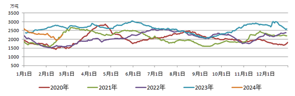 2024年伊始,主产区煤价稳中小幅涨跌,贸易商发运到港积极性低,虽然受寒潮短期影响市场需求有所增加,但在电厂去库缓慢、进口煤高位,以及下游观望采购的大背景下,环渤海港口下锚船数量并未出现大幅增加。而随着春节临近,港口调入量下降,环渤海港口库存持续去库。2月14日,环渤海港口库存降至2000万吨以内,达1947.9万吨。节后,产地放假煤矿开始陆续复工,煤炭产量随之增加,港口日均调入量恢复至162万吨中位水平。且寒潮再次大举南下,沿海海域大风大雾天气频发,受其影响,18日至今多港开启频繁的封航模式,船舶装卸作业严重下降,日均调出量降至128万吨偏低水平。同时,国内煤炭主要港口迎来了一波进口煤“年货”扎堆到港待卸的情况。多重因素下,港口库存回升。2月23日环渤海港口库存升至2266.8万吨,较年内低点回升318.9万吨。