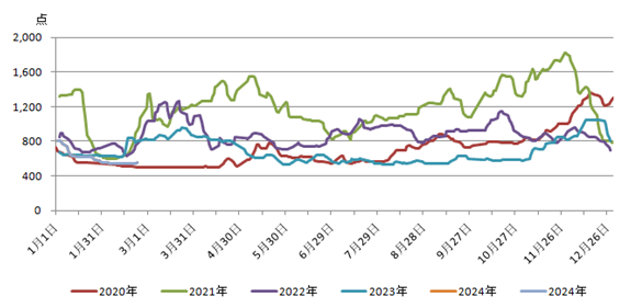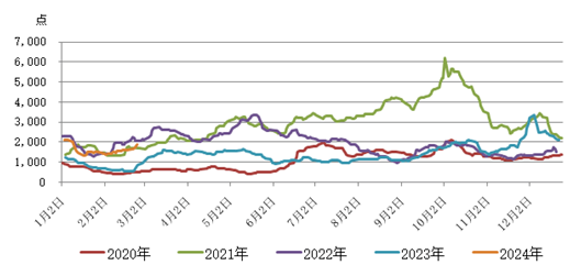 2024年伊始,受中国春节前季节性需求放缓影响,好望角型、巴拿马型、超灵便型三大船型指数下行,带动波罗的海干散货指数(BDI)连续下跌,1月10日下跌211点,跌幅达11.3%至1664点,后续继续下降但跌幅有所收窄,至1月17日报收于1308点,为4个月以来的最低水平。随后,BDI指数窄幅波动,2月中旬,开启上行。2月23日波罗的海干散货指数(BDI)连续第6天上涨,报收1866点,创2024年1月10日以来新高,日环比上涨6.5%。