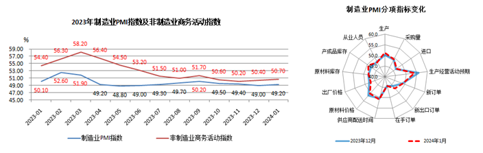 历经2023年四季度PMI持续走弱后,2024年1月制造业采购经理指数重拾升势,且回升幅度好于季节性。据国家统计局数据,2024年1月,我国制造业PMI、非制造业商务活动指数(非制造业PMI)和综合PMI产出指数分别为49.2%、50.7%和50.9%,比上月上升0.2、0.3和0.6个百分点,我国经济景气水平有所回升。