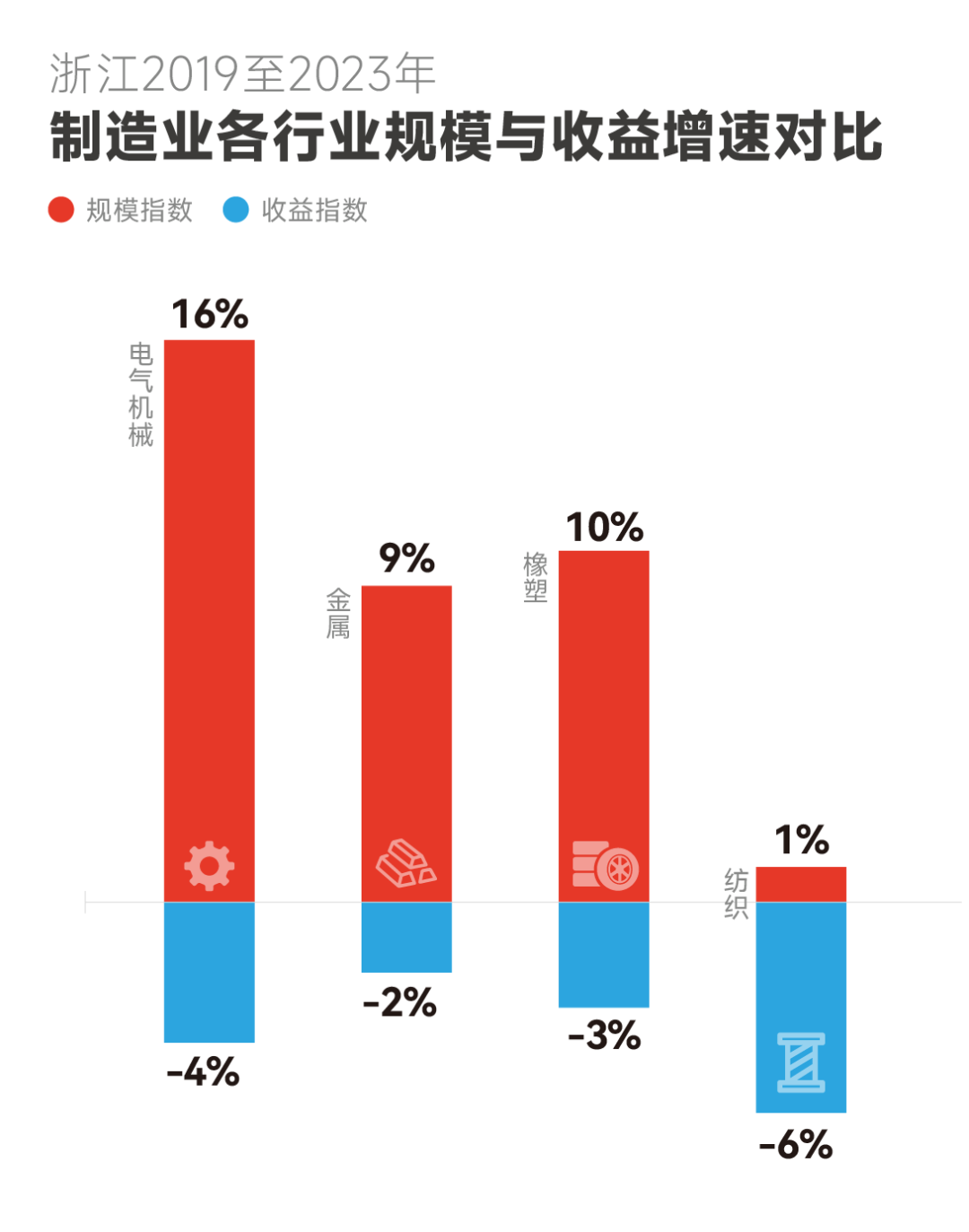 分析数据显示,2019至2023年,浙江60%的制造业行业规模指数呈上涨趋势,其中,电气机械、金属、橡塑、纺织四行业年均上涨约16%、9%、10%、1%;与之相反,58%的制造业行业收益指数呈下降趋势,上述四行业年均下降4%、2%、3%、6%。