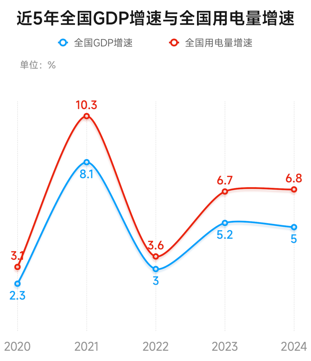 数据显示,2024年中国全社会用电量98521亿千瓦时,增速6.8%;全国GDP1349084亿元,增速5.0%。