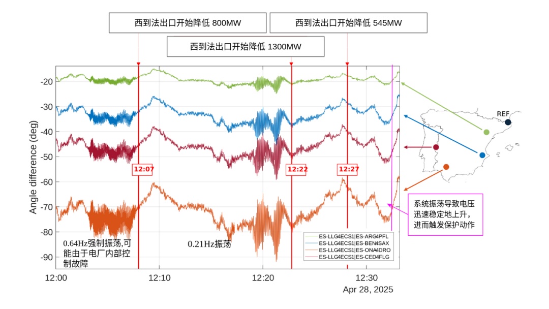 第0阶段“电压不稳”:在4月25日至27日左右,电网已观测到明显的电压波动和振荡现象。4月28日早上9点左右电压不稳定的情况更加强烈,但是在系统可控范围内。目前频率波动的初始原因还在调查中。