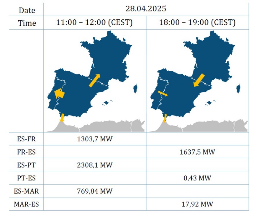 图四:在事故发生前(左),西班牙是净电力出口国,当时的发电量高于其国内用电需求。在事故发生后(右),由于西班牙具有自启动能力的发电机组或构网型逆变器不足,所以需要利用摩洛哥和法国境内的传统机组进行电网同步的恢复。