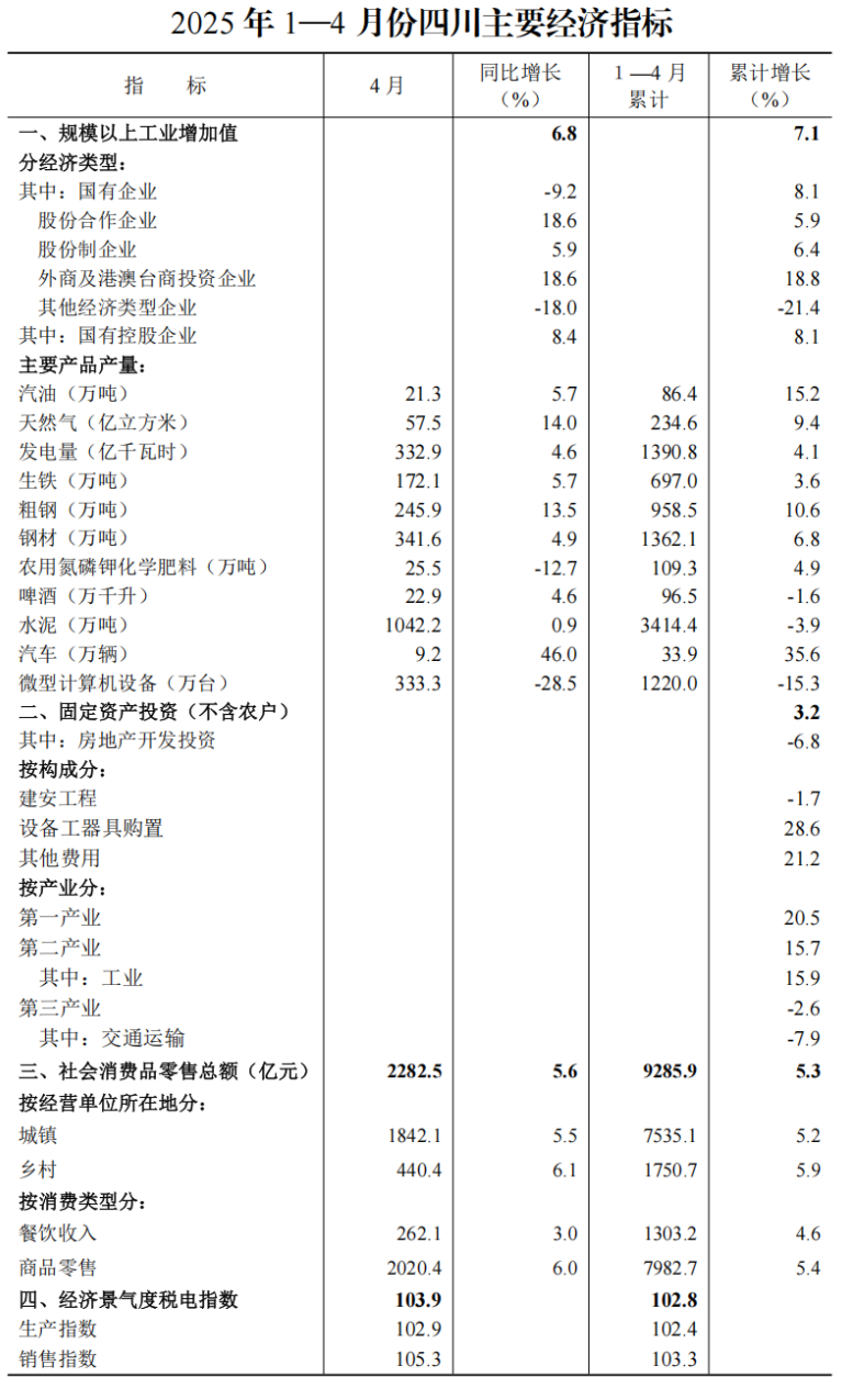 5月20日,四川统计局发布数据显示,2025年1-4月全省国民经济主要指标数据。
