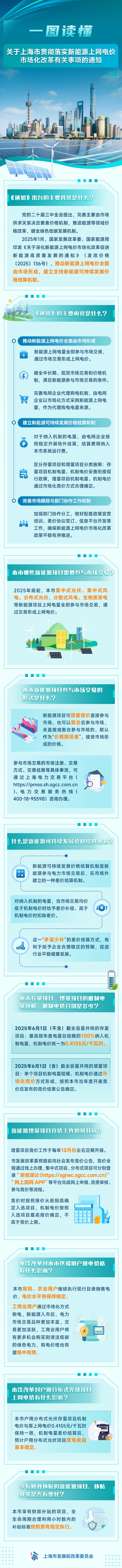 上海市发展改革委介绍,为推动新能源公平参与电力市场交易,促进新能源高质量可持续发展,《关于上海市贯彻落实新能源上网电价市场化改革有关事项的通知》近日发布。通知主要包括推动新能源上网电价全面由市场形成、建立新能源可持续发展价格结算机制、完善市场跟踪与部门协作工作机制等三个方面共17条措施,将试行至2026年底