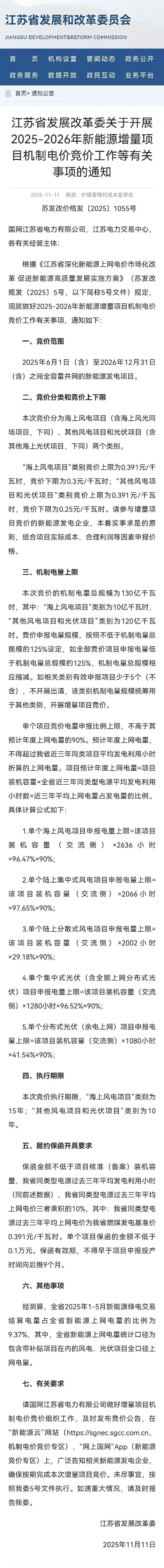 11月11日,江苏省发展改革委发布关于开展2025-2026年新能源增量项目机制电价竞价工作等有关事项的通知。竞价范围为2025年6月1日(含)至2026年12月31日(含)之间全容量并网的新能源发电项目。本次竞价分为海上风电项目(含海上风光同场项目,下同)、其他风电项目和光伏项目(含其他海上光伏项目,下同)两个类别。“海上风电项目”类别竞价上限为0.391元/千瓦时,竞价下限为0.3元/千瓦时;“其他风电项目和光伏项目”类别竞价上限为0.391元/千瓦时,竞价下限为0.25元/千瓦时。通知提出,请参与增量项目竞价的新能源发电企业,本着实事求是的原则,结合项目实际成本、合理利润等因素申报价格。