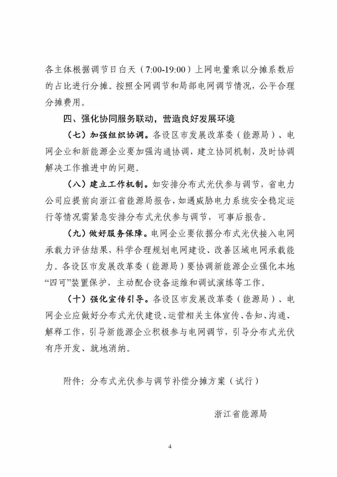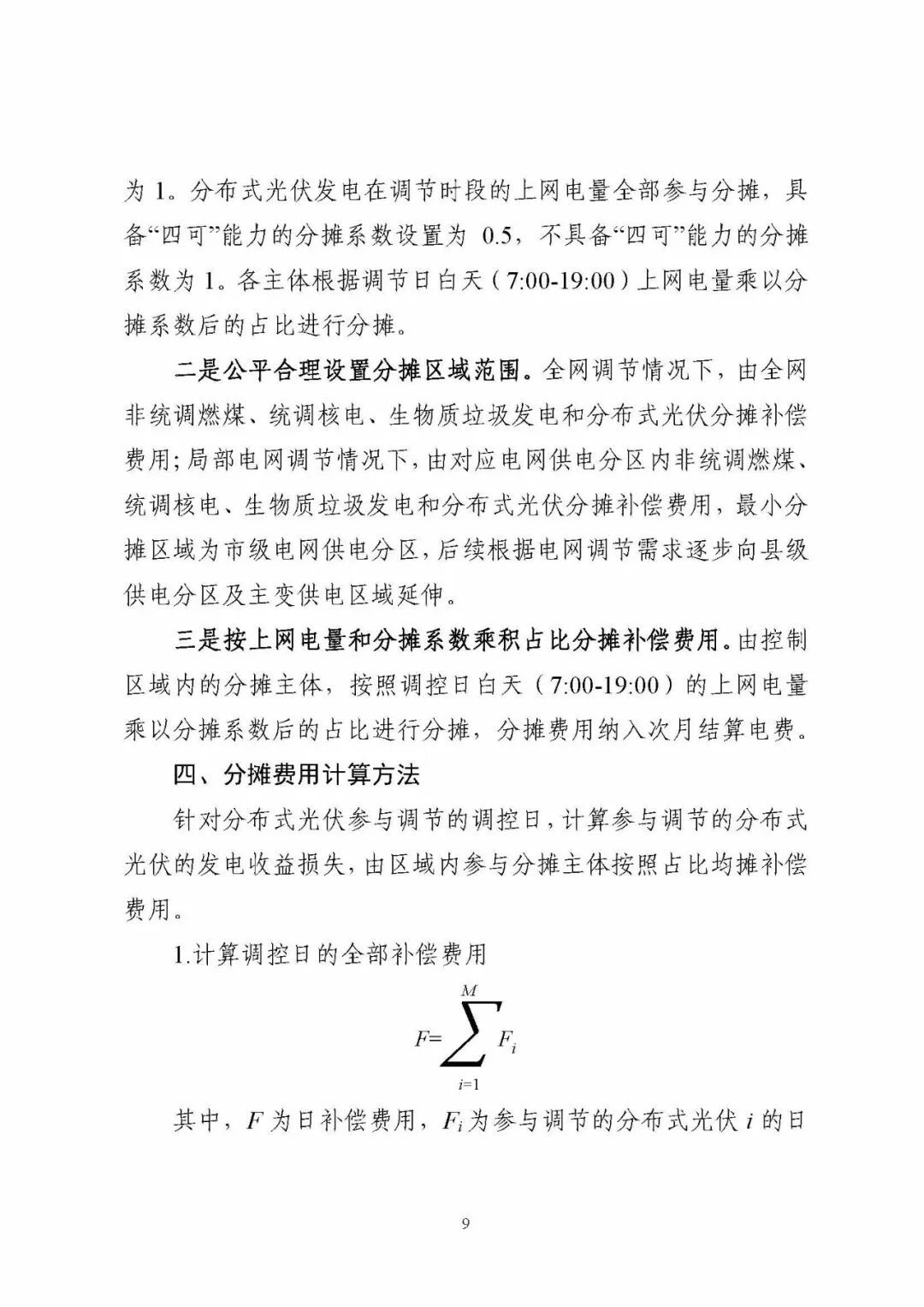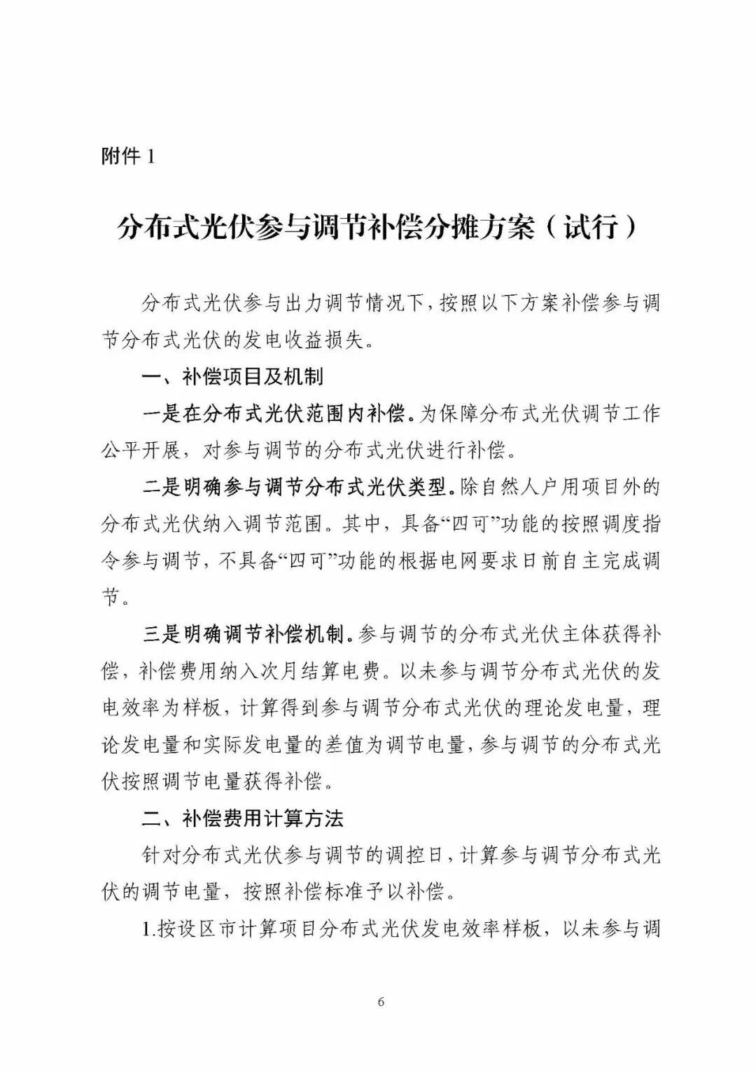 文件明确了参与调节分布式光伏类型及分摊范围、机制。除自然人户用项目外的分布式光伏纳入调节范围。其中,具备“四可”功能的按照调度指令参与调节,不具备“四可”功能的根据电网要求日前自主完成调节。