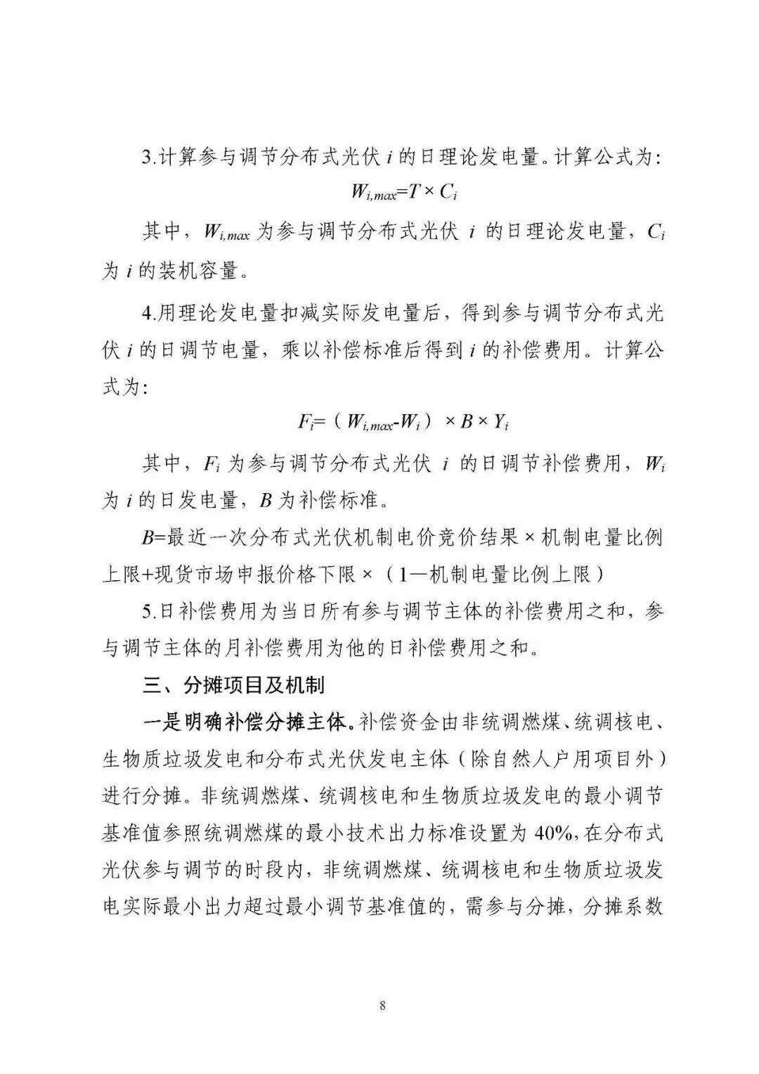 参与调节的分布式光伏主体获得补偿,补偿费用纳入次月结算电费。补偿资金由非统调燃煤、统调核电、生物质垃圾发电和分布式光伏发电主体(除自然人户用项目外)进行分摊。