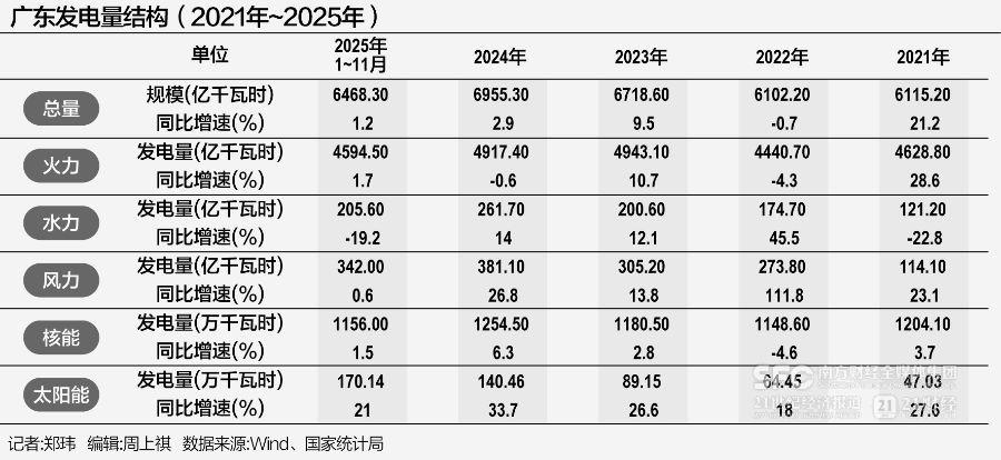从发电量的整体构成看,“十四五”期间,广东全省火力发电量占比已从2021年末的约75.69%降低至2025年11月的71.03%,同期水力、风力和太阳能发电量占比则分别从1.98%、1.87%、0.77%提高至3.18%、5.29%、2.63%。