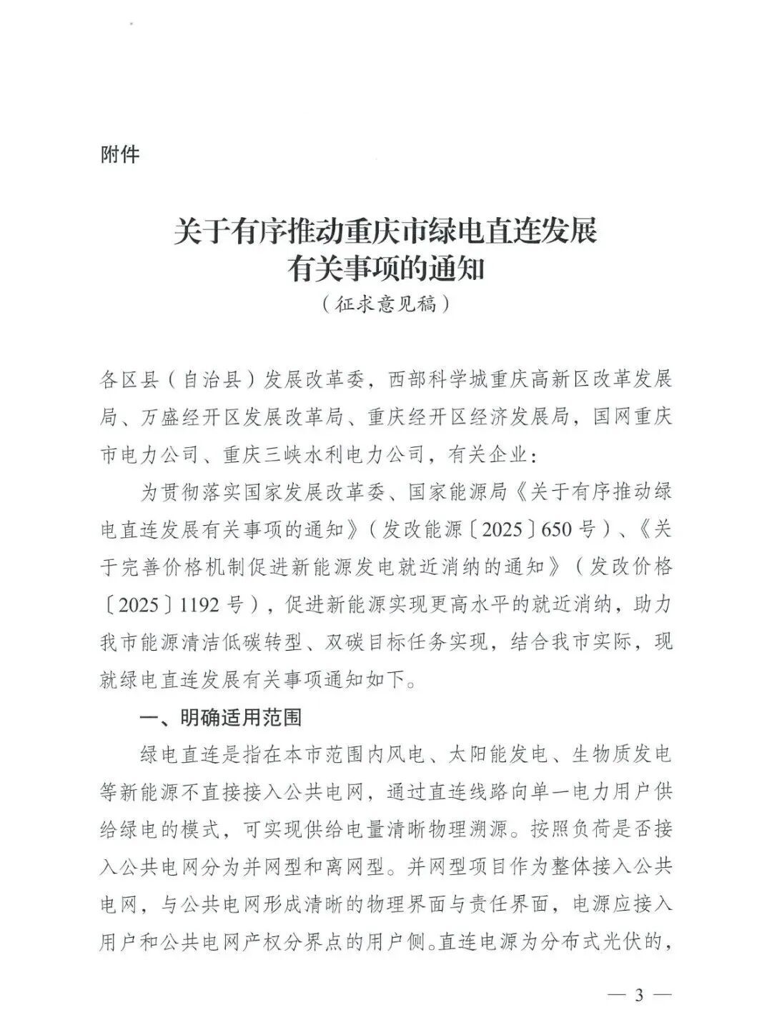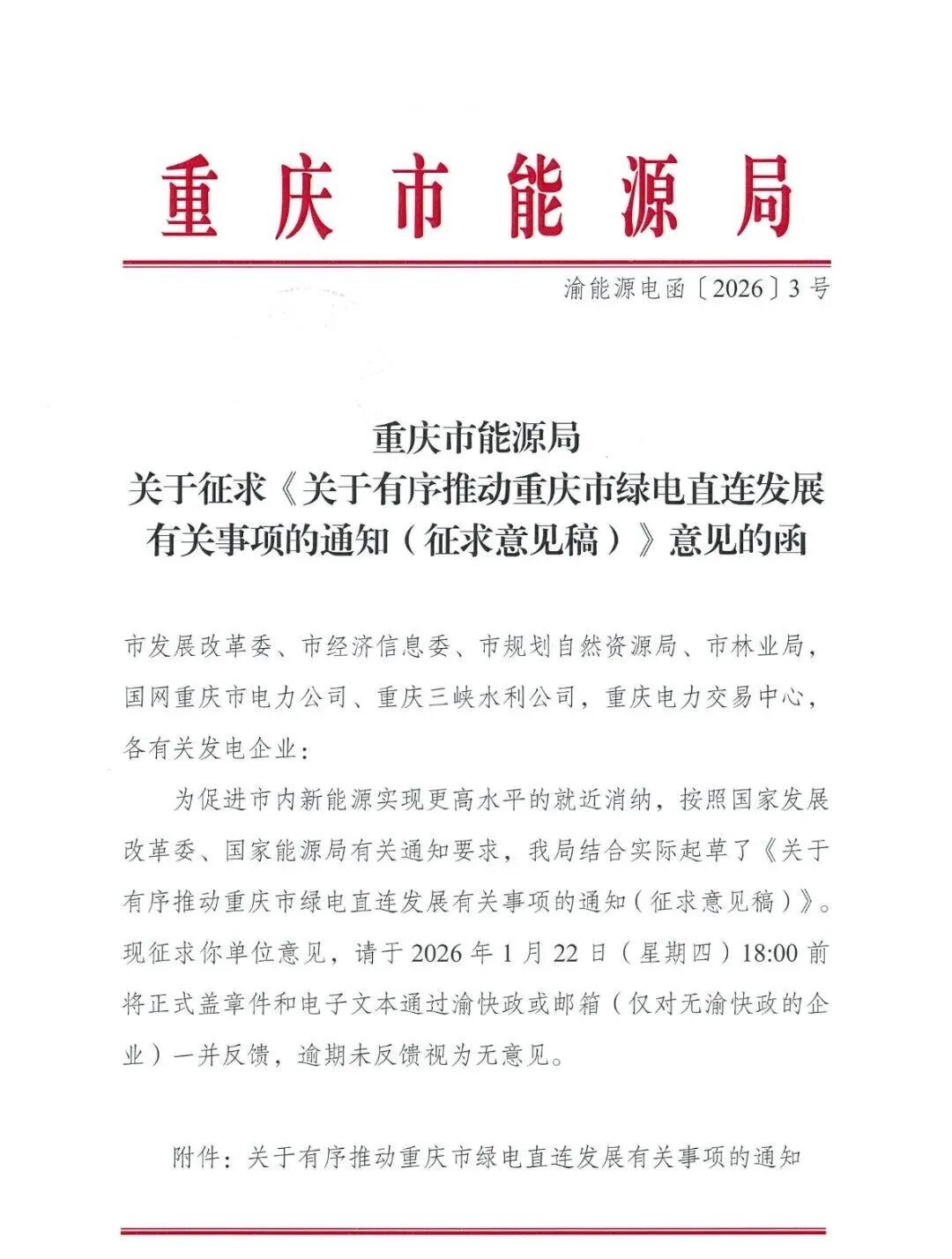 近日,重庆市能源局发布关于征求《关于有序推动重庆市绿电直连发展有关事项的通知(征求意见稿)》意见的函。