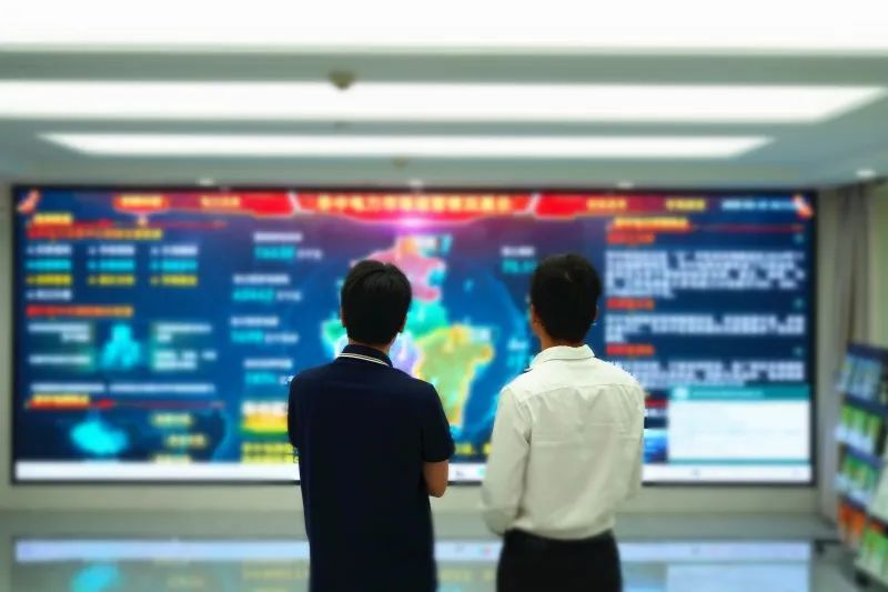 ▲国网华中分部市场交易大厅工作人员查看当天交易数据