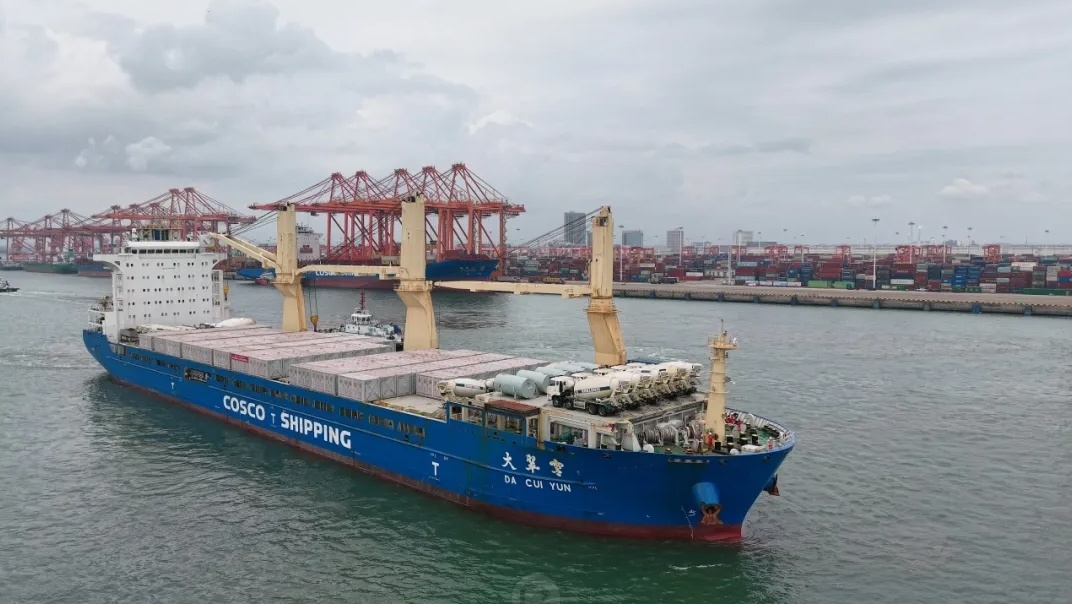面对超重危险品运输的挑战,在陆运环节,中远海运特运联合广西交通运输厅、北部湾港集团创新实施“综合交通+新能源”(大容量储能电池运输保障)试点工作方案,25台备案车辆“专车专用”,通过采用“厂港直通”模式,实现工厂提货与船舶到港计划的无缝衔接,满足了项目货物快速集港的要求。在海运段,采用重吊船与纸浆船的多船型组合方案,并选择波斯湾达曼港与红海吉达港双线卸货,既优化运输成本,又保障交付时效。