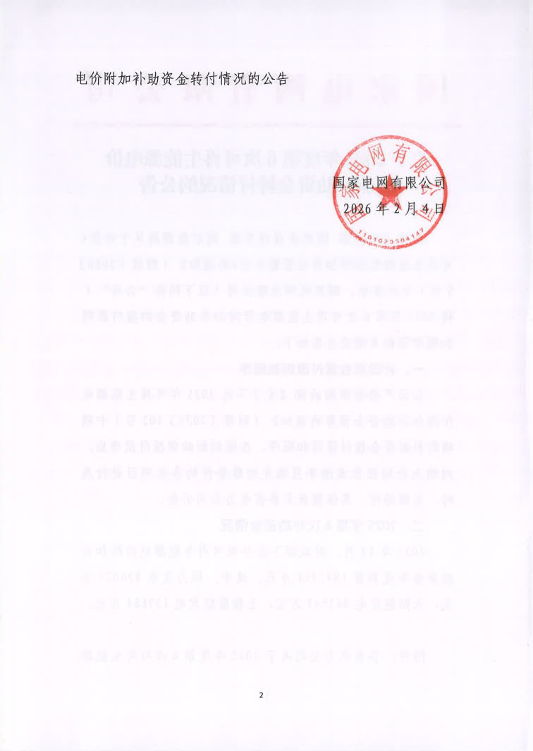 2月24日,国家电网有限公司发布了关于2025年度第6次可再生能源电价附加补助资金转付情况的公告。