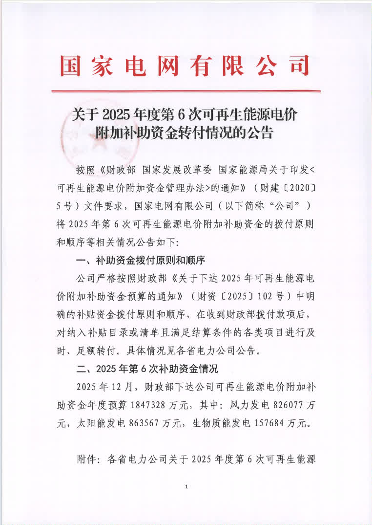 公告明确,2025年第6次补助资金情况:2025年12月,财政部下达公司可再生能源电价附加补助资金年度预算1847328万元,其中:风力发电826077万元,太阳能发电863567万元,生物质能发电157684万元。