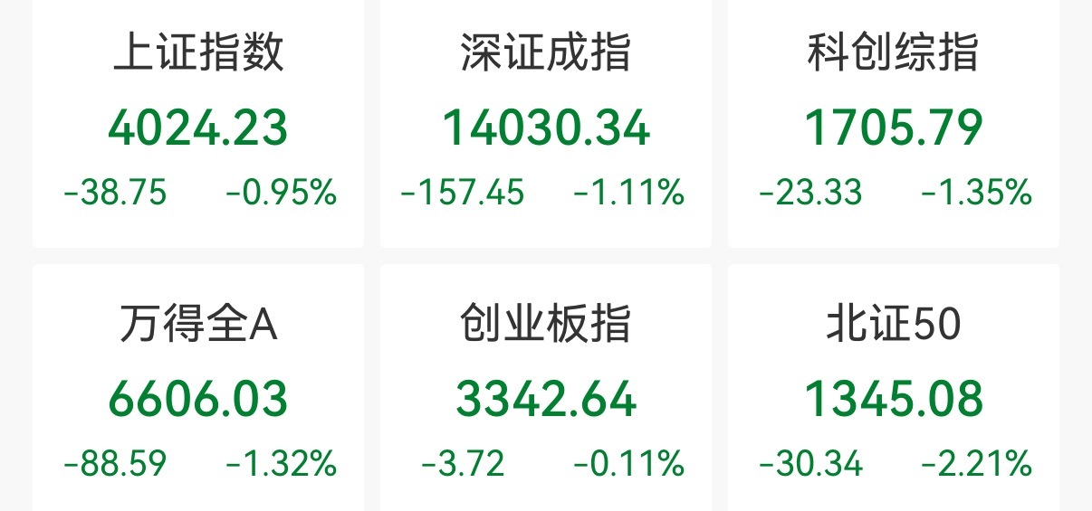 19日上午,A股三大指数低开震荡。截至午盘,上证指数跌0.95%,报4024.23点;深证成指跌1.11%,报14030.34点;创业板指跌0.11%,报3342.64点。