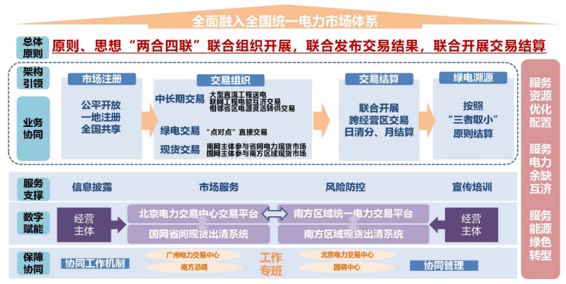 建设全国统一电力市场,是党中央、国务院构建新发展格局的重要部署,而跨经营区交易则是其中最关键的一块“拼图”。长期以来,我国电力市场形成南网、国网“双轨并行”的格局,南方五省(区)与国网26个省(区、市)的电力资源各自循环,省间壁垒成为制约能源全国优化配置的核心堵点。为破解这一难题,在国家部委的统筹指导下,广州电力交易中心联合北京电力交易中心、两网调度中心组建工作专班,汇聚多方力量开展机制创新,以“三个有利于”“四个协同”为基本原则,以“架构引领、业务协同、服务支撑、数字赋能、组织保障”为核心抓手,系统性构建起跨经营区交易的完整体系,为全国统一电力市场建设开辟了一条“分类推进、螺旋提升”的典型实践路径。
