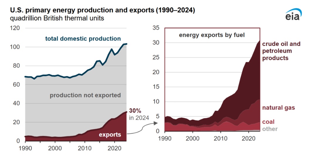 美国能源信息署(EIA)近期披露,2024年,美国将其国内一次能源产量的约30%用于出口,出口量创历史新高。这些出口的能源几乎都是化石燃料,主要流向北美、欧洲和亚洲国家,据EIA分析,这得益于美国能源产量持续提升、政策放开、地缘政治变动和基础设施扩建等多重因素。