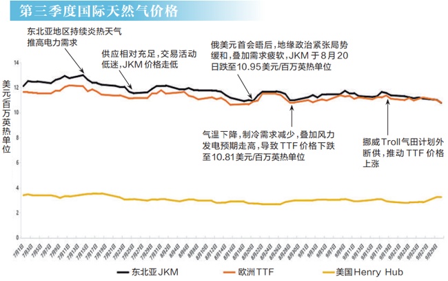 今年第三季度,国际天然气市场供需整体维持平衡。亚洲市场基本面偏弱,欧洲LNG进口量持续同比大幅增长,地下储气库平稳注气,库存差距较此前进一步收窄。第三季度,亚欧气价同比、环比均呈走跌趋势;预计第四季度北半球普遍偏暖,LNG供应量稳定增长,国际气价较第三季度小幅走高,大幅上涨可能性有限。