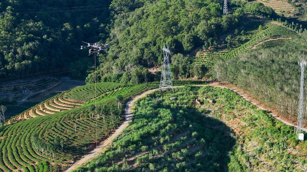 中老500千伏联网工程在施工过程中运用无人机集群作业方式开展施工物资运输。(张强摄)
