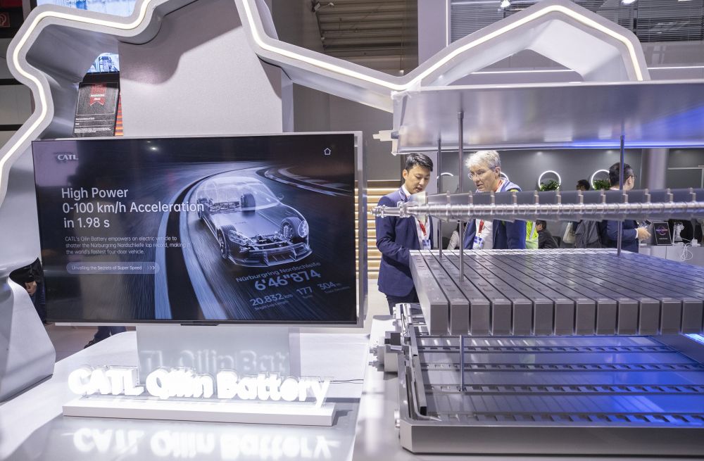 2025年9月10日,人们在德国慕尼黑国际车展的宁德时代展台洽谈。(张帆摄)