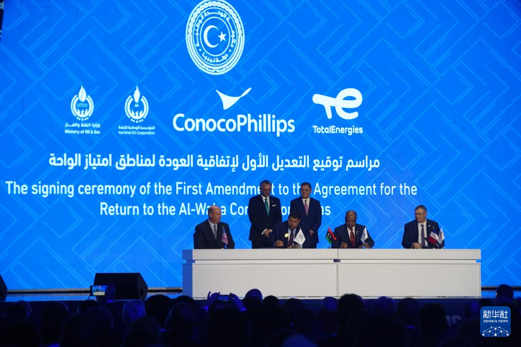 1月24日,在利比亚首都的黎波里,利比亚与法国道达尔能源公司和美国康菲石油公司举行协议签字仪式。新华社发(哈泽姆·图尔基亚摄)