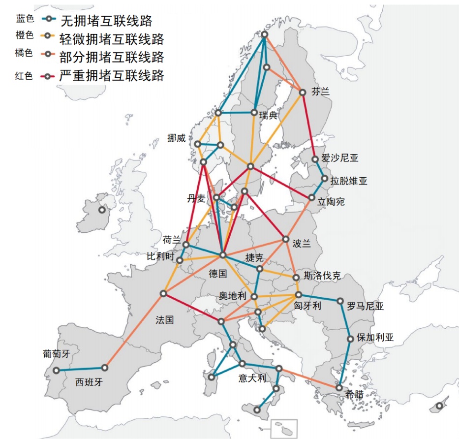 图1欧盟各竞价区电网拥堵情况示意图(来源:欧盟能源监管合作署ACER)