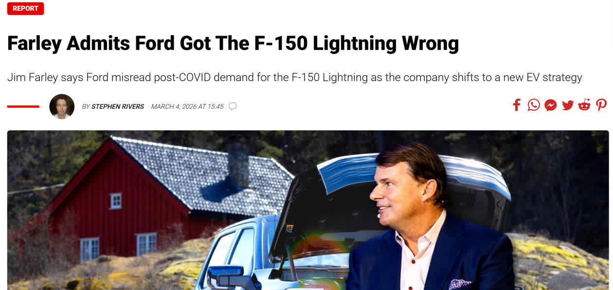 3月6日消息,据Carscoops报道,福特公司首席执行官吉姆·法利近日就旗下纯电皮卡F-150 Lightning项目的失利作出反思,明确表示福特在该项目上对市场需求和行业发展趋势存在明显误判,同时坦言燃油车时代的思维惯性成为企业发展纯电车型的重要掣肘。