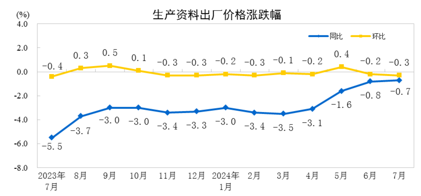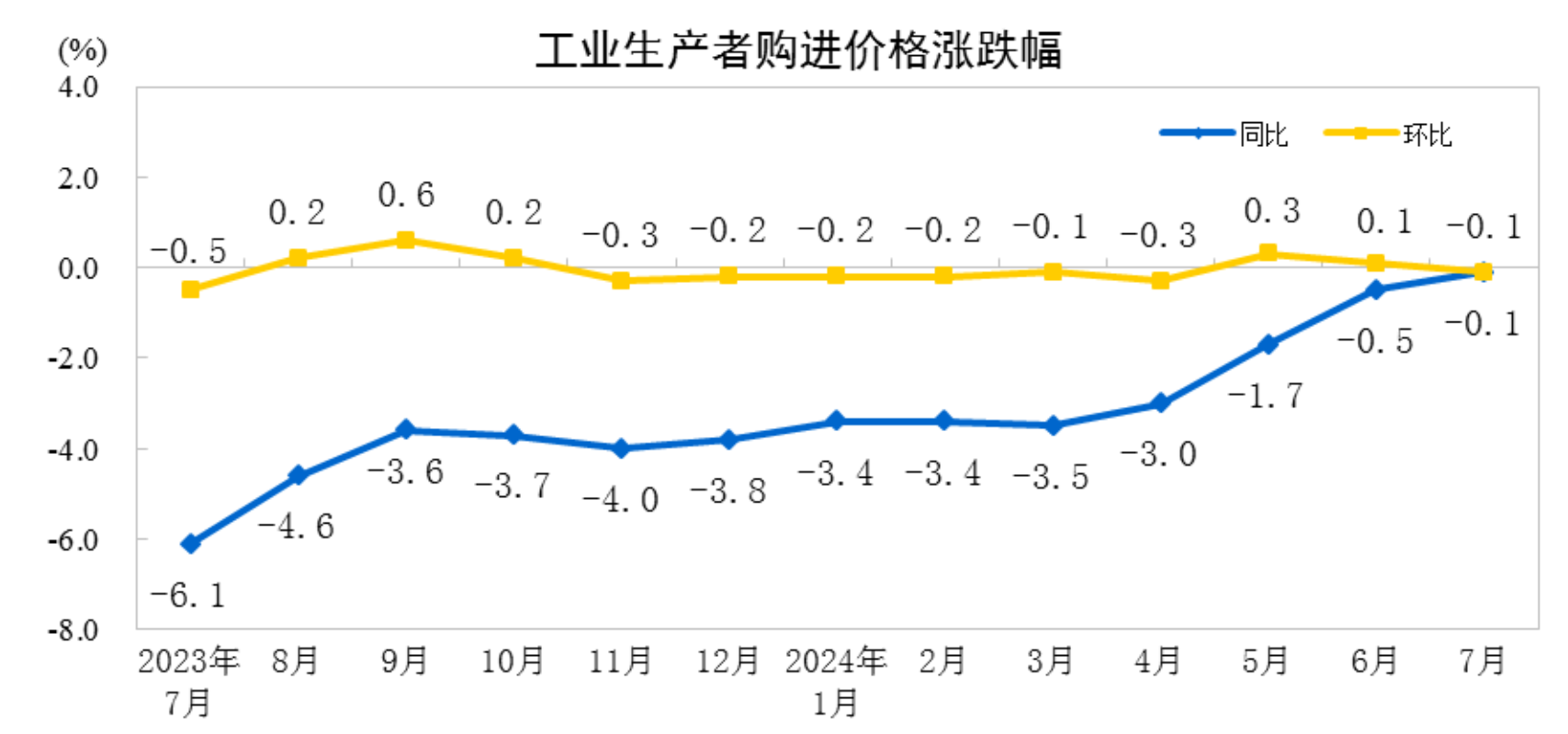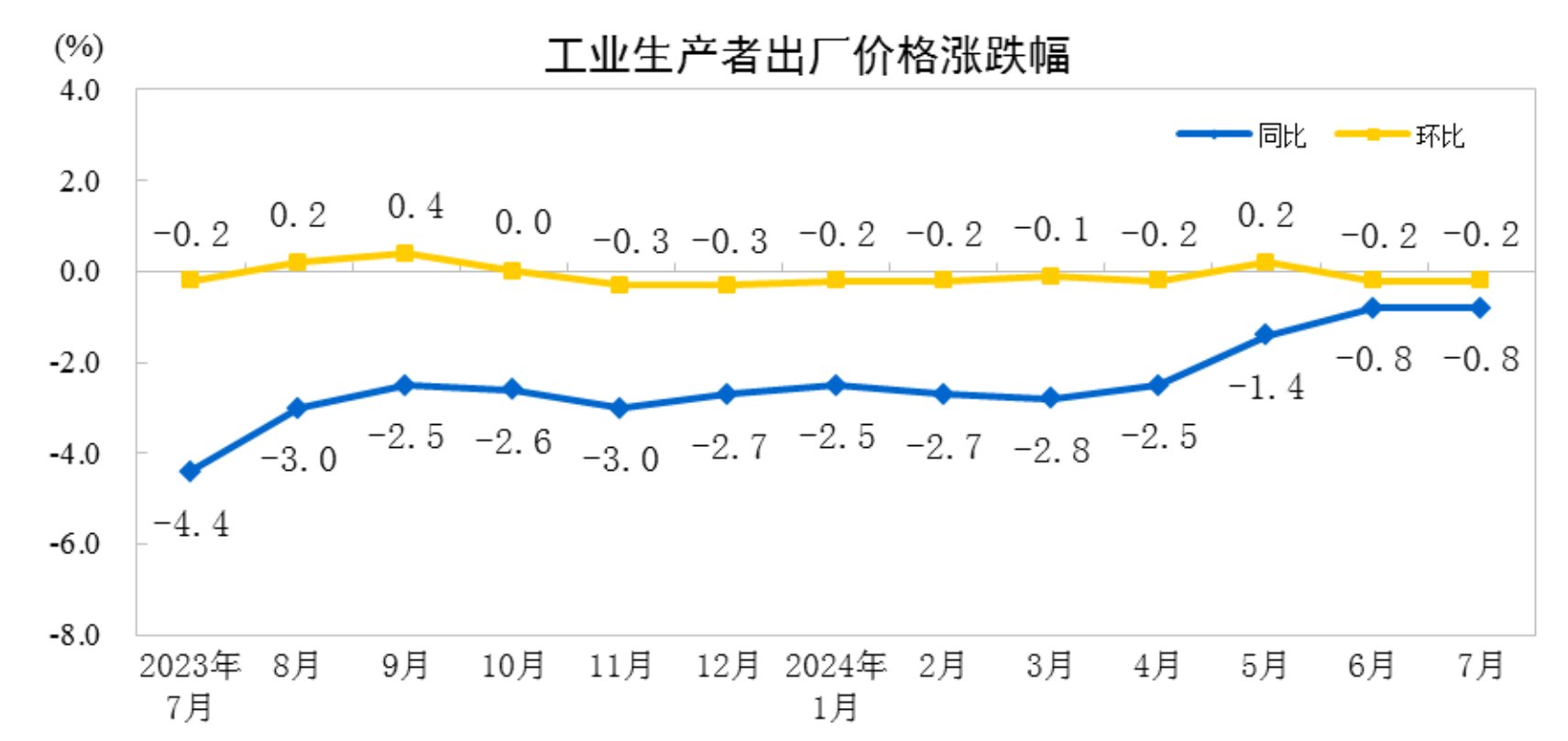 2024年7月份,全国工业生产者出厂价格同比下降0.8%,环比下降0.2%,降幅均与6月相同;工业生产者购进价格同比、环比均下降0.1%。1—7月平均,工业生产者出厂价格比上年同期下降2.0%,工业生产者购进价格下降2.2%。