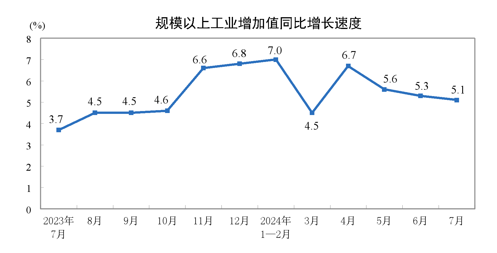 7月份,规模以上工业增加值同比实际增长5.1%(增加值增速均为扣除价格因素的实际增长率)。从环比看,7月份,规模以上工业增加值比上月增长0.35%。1—7月份,规模以上工业增加值同比增长5.9%。
