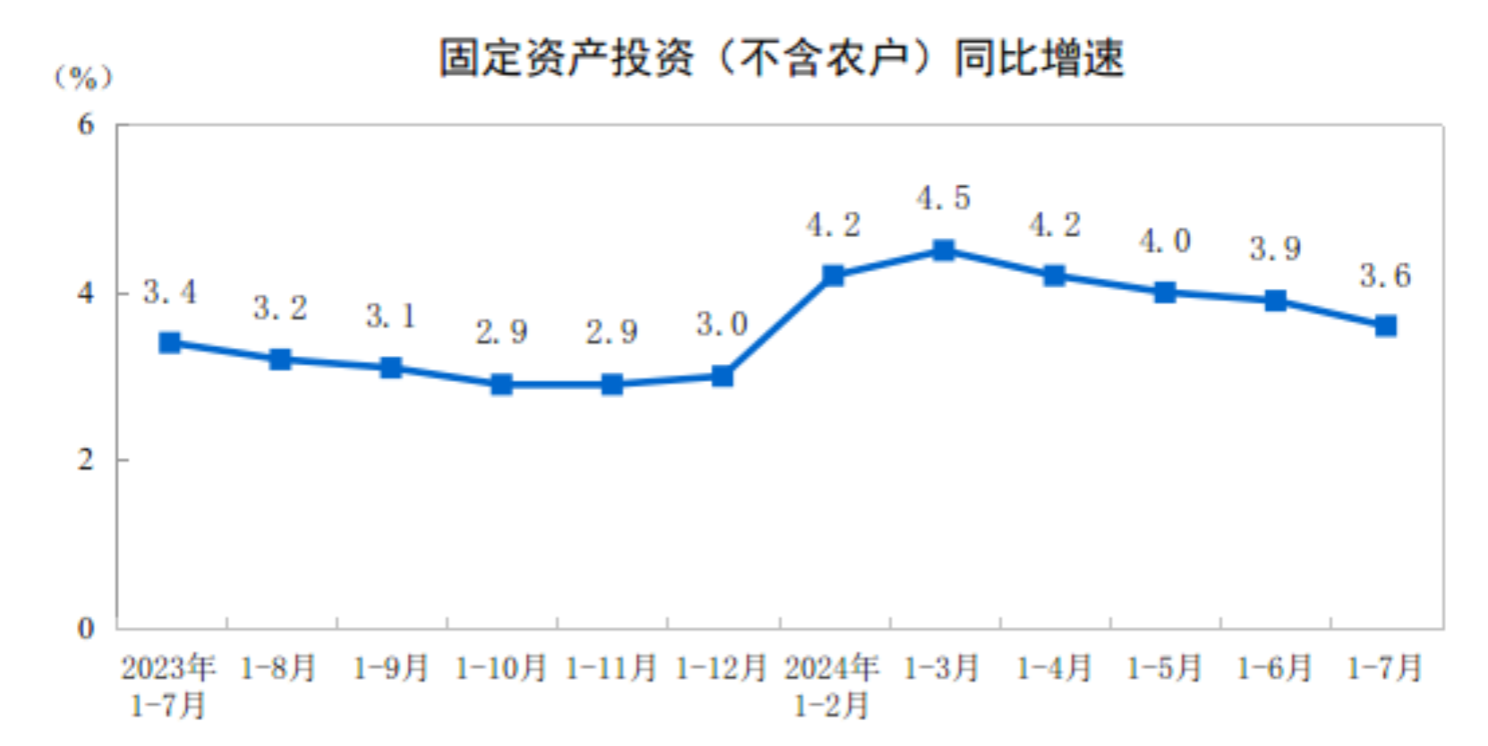 2024年1—7月份,全国固定资产投资(不含农户)287611亿元,同比增长3.6%(按可比口径计算,详见附注7),其中,民间固定资产投资147139亿元,与去年同期持平。从环比看,7月份固定资产投资(不含农户)下降0.17%。