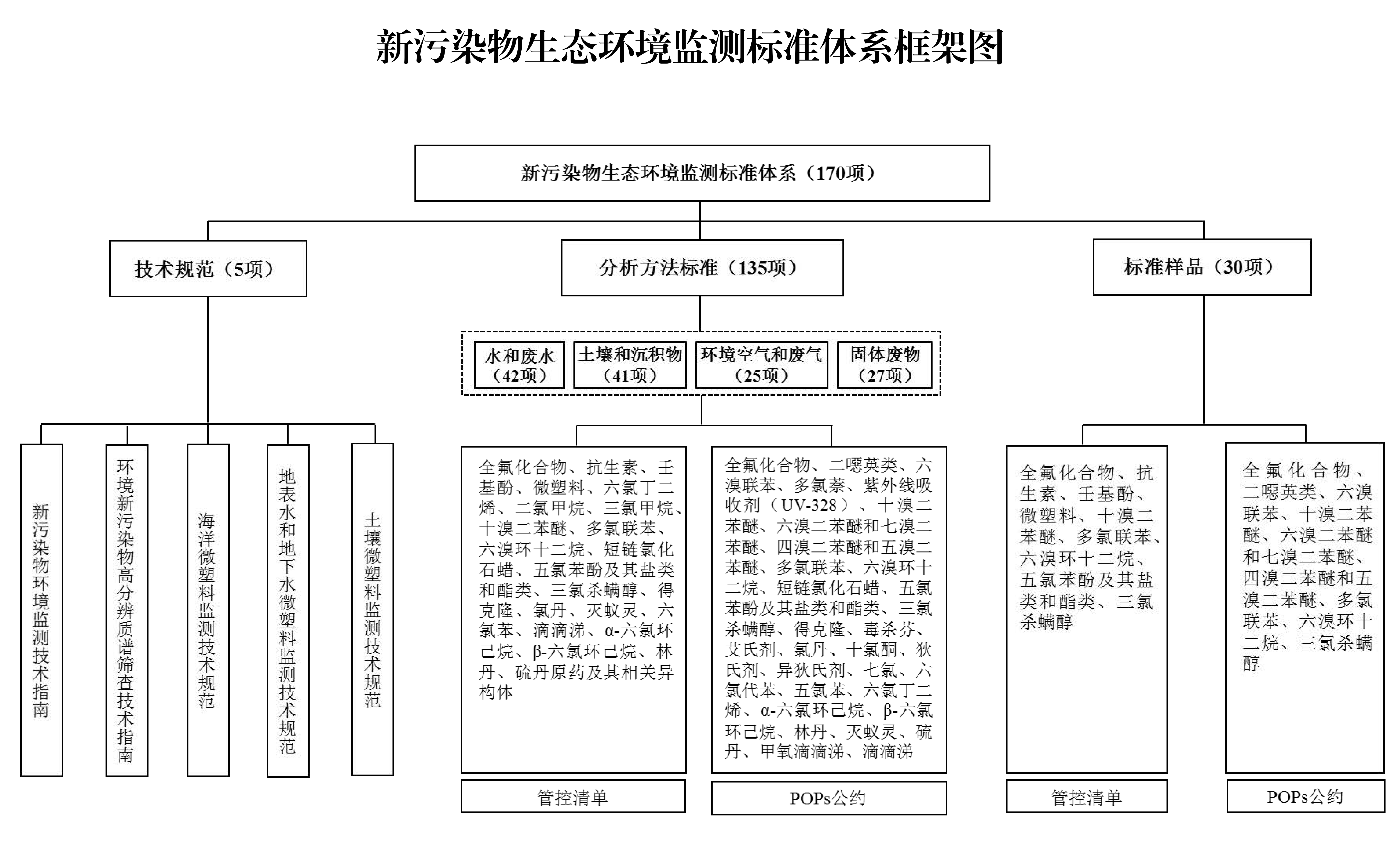 为落实《新污染物治理行动方案》,加强新污染物生态环境监测标准顶层设计,积极推动新污染物治理体系和治理能力现代化建设,我部组织编制了《新污染物生态环境监测标准体系表(2024年版)》,由新污染物生态环境监测标准体系框架图和体系项目表构成。现印发给你们,供开展新污染物调查监测、监督管理等工作参考。可转发给有关技术单位,开展标准预研究工作。